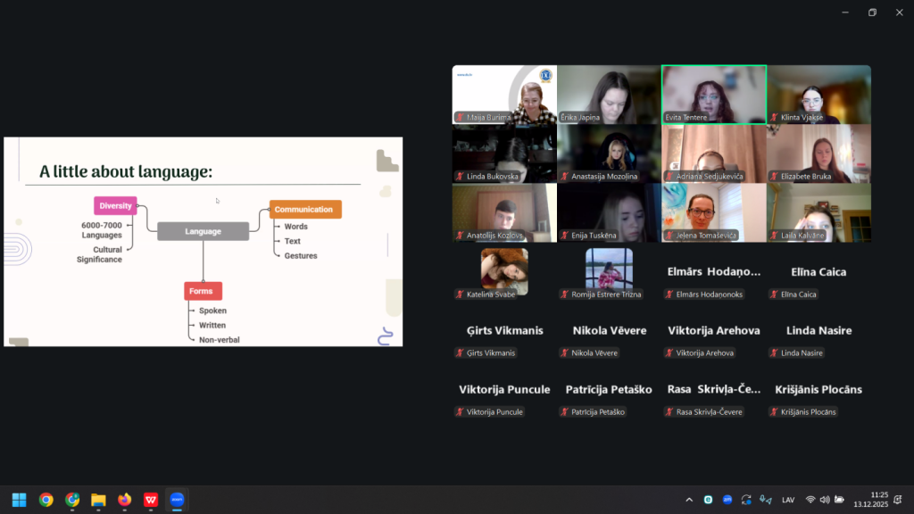 Nodarbības laikā studentes iepazīstināja ar sevi, dalījās pieredzē par anglistikas studijām Daugavpils Universitātē, izceļot gan ieguvumus, gan izaicinājumus. Tika runāts par valodas daudzveidību, tās iespējām, uzsverot, ka valoda nav tikai gramatika, bet arī cilvēka identitātes, pārliecības un domāšanas atspoguļojums.