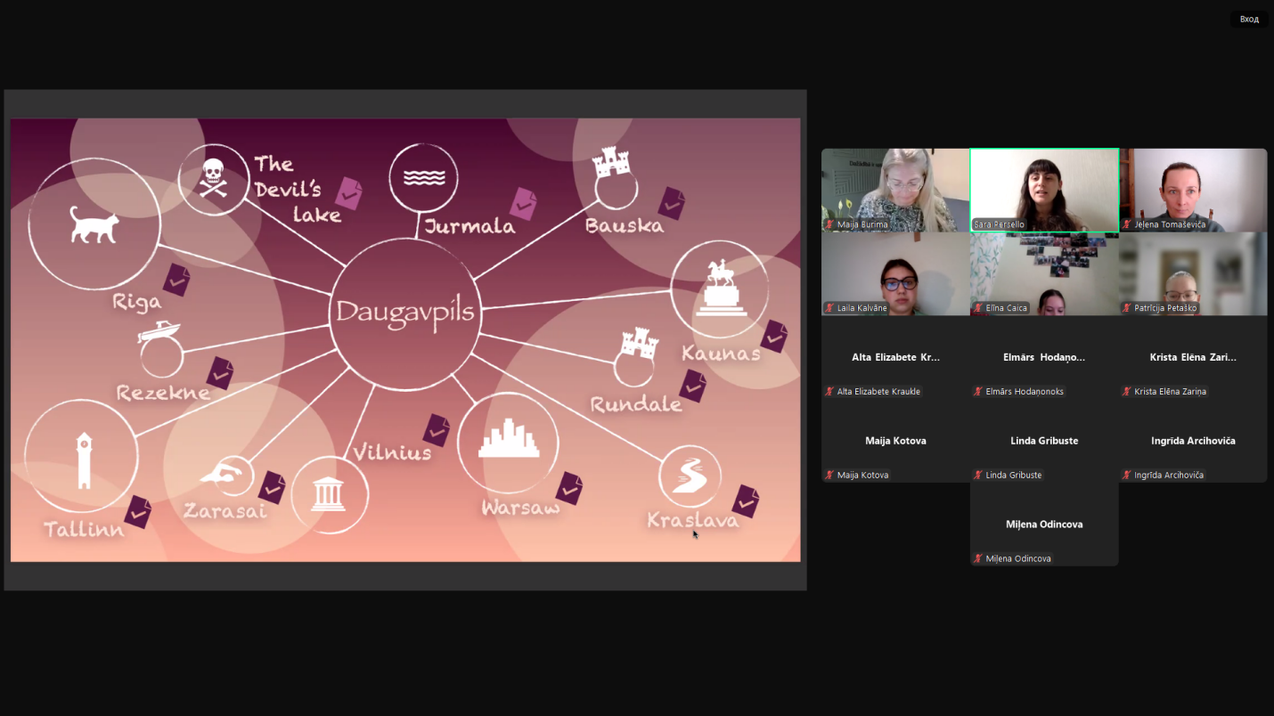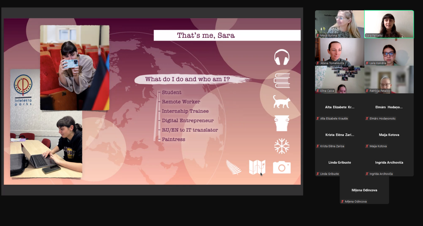 Otro nodarbību „Humanitārā joma Daugavpils Universitātē: Erasmus+ studenta izaicinājumi” vadīja Sara Persello, 2024. gada studentu apmaiņas programmas Erasmus+ DU studējošā no Itālijas. Jauniete dalījās ar saviem iespaidiem, ko ieguvusi, dzīvojot un studējot Daugavpilī. Viņu priecē daugavpiliešu viesmīlība, kā arī īpašā studiju vide, kas veicina gan akadēmisko izaugsmi, gan personisko attīstību. Līdztekus tam Sara nodarbības dalībniekus aicināja aizraujošā virtuālā ceļojumā pa Itālijas pilsētām. Vidusskolēniem bija iespēja iepazīt Florenci, Toskānu, Kuarratu, Pistoiju, to vēsturi un kultūru. Sara piedāvāja jauniešiem apgūt dažas pamatfrāzes itāliski.