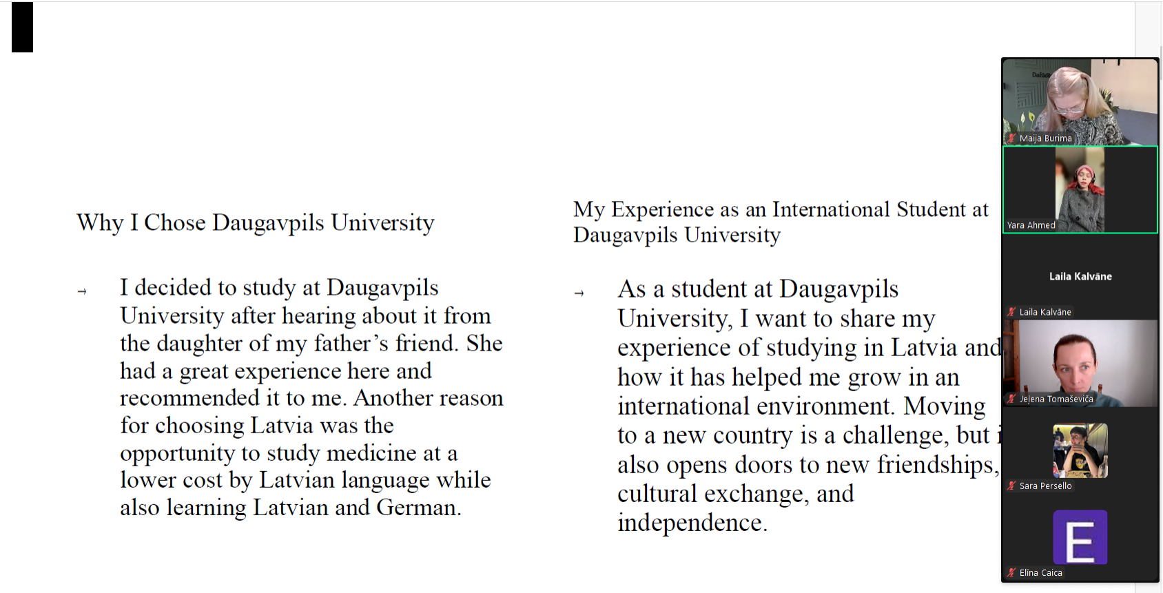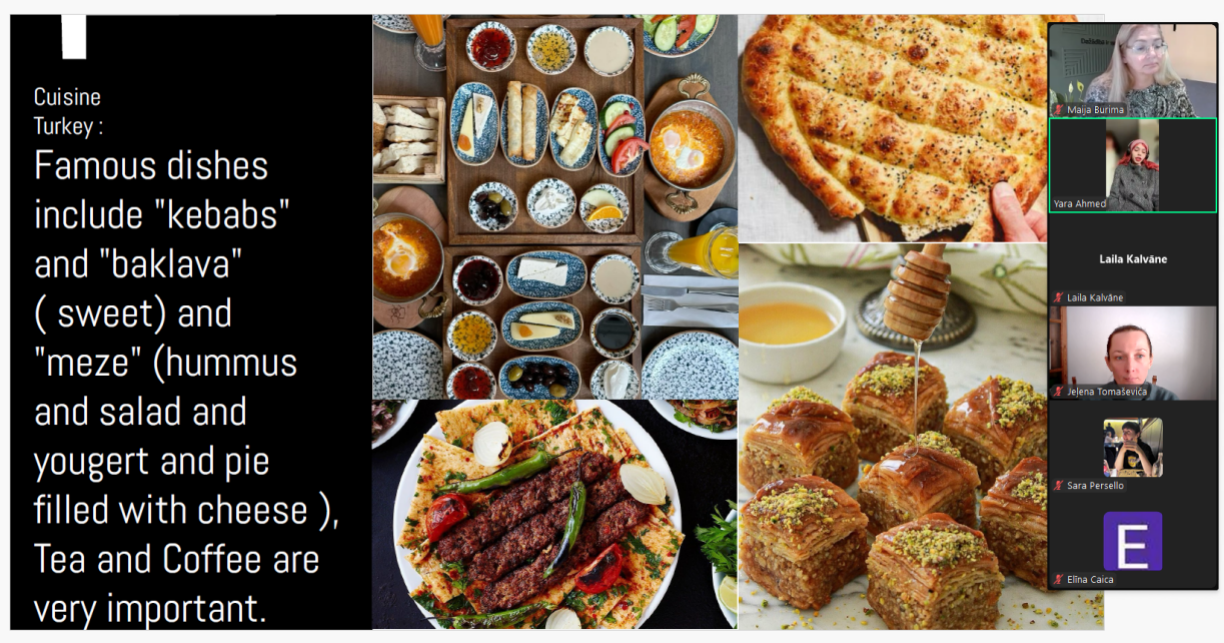 Trešo nodarbību “Cultural Kaleidoscope: Exploring the Traditions of Turkey and Sudan” vadīja DU ABSP „Valodu un kultūras studijas” 3. studiju gada studējošā Yara Hamid Ahmed.  Viņa minēja faktorus, kuri noteikuši izvēli studēt Latvijā, atzinīgi novērtēja studiju iespējas un priekšrocības Daugavpils Universitātē. Yara kā divu valstu – Turcijas un Sudānas – pilsone ieinteresēja vidusskolēnus ar savu unikālo pieredzi, ar stāstījumu par to, kā dzīve starp divām atšķirīgām kultūrām veido viņas identitāti un skatījumu uz pasauli, kā Turcijas vēstures mantojums un ģimenes vērtības mijiedarbojas ar Sudānas sabiedrībā pastāvošajām stingrajām normām.