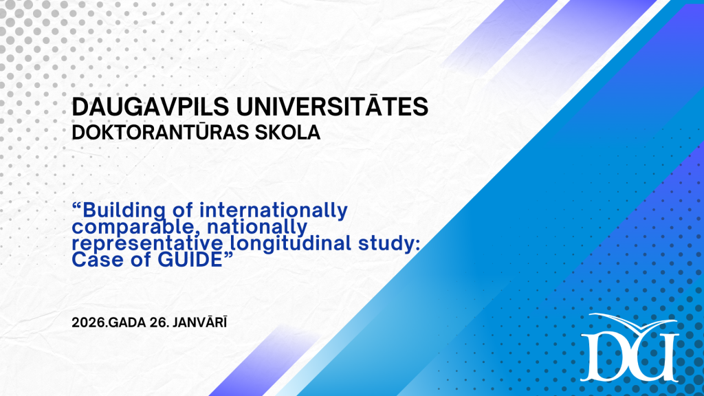 Daugavpils Universitāte aicina doktorantus, akadēmisko personālu un citus interesentus piedalīties Doktorantūras skolas lekcijā “Building of internationally comparable, nationally representative longitudinal study: Case of GUIDE”, kas notiks 2026. gada 26. janvārī plkst. 14.00 tiešsaistē, Zoom platformā.