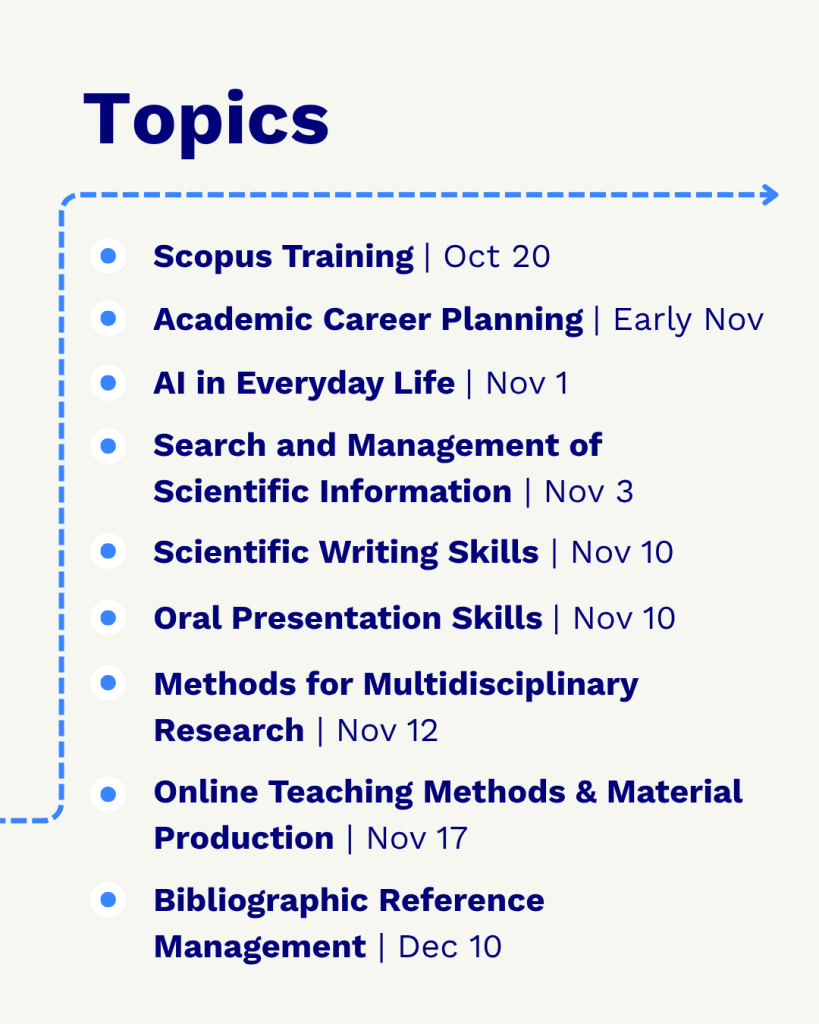 *Izņēmums ir kurss “Scopus Training” (20.10.2025), kurā bez iepriekšējas atlases var piedalīties visi interesenti, aizpildot pieteikuma veidlapu.