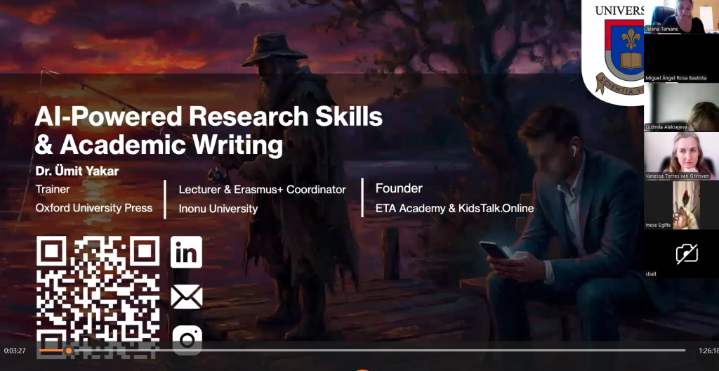 2026. gada 20. martā Daugavpils Universitātes Doktorantūras skolas ietvaros norisinājās starptautisks vebinārs “Pētniecības prasmes un akadēmiskā rakstīšana ar mākslīgā intelekta atbalstu”. Nodarbību vadīja Ineni Universitātes (Turcija) docētājs, izglītības zinātņu doktors Dr. Umits Jakars (Dr. Ümit Yakar), kuram ir vairāk nekā desmit gadu pieredze izglītības tehnoloģiju jomā.