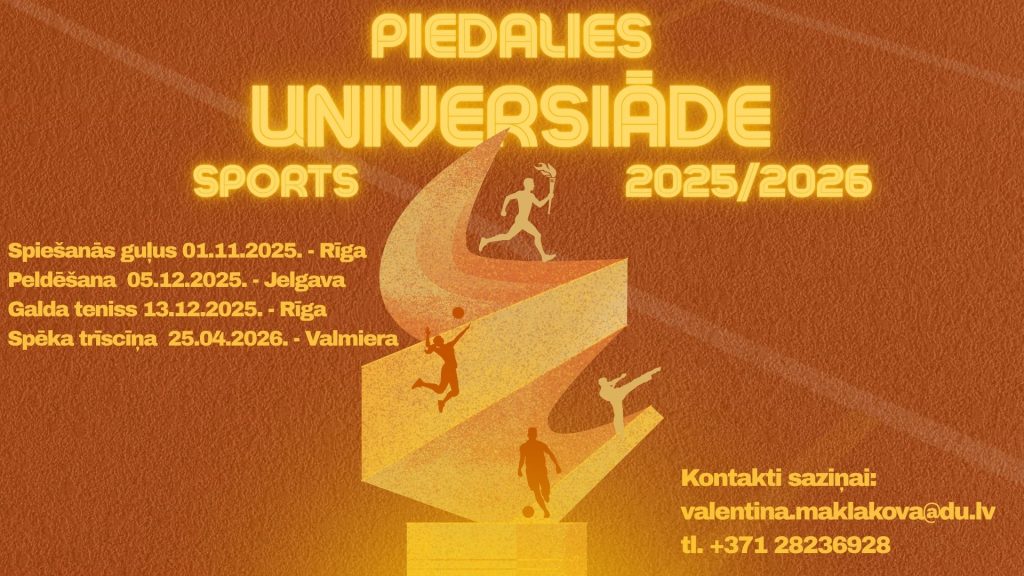 Daugavpils Universitātes studenti ir aicināti piedalīties Latvijas XXXVI Universiādē 2025./2026., kas apvieno dažādu sporta veidu sacensības visā Latvijā. Universiāde ir viens no lielākajiem sporta pasākumiem augstskolu vidē, sniedzot iespēju pārstāvēt savu universitāti un sacensties ar citu augstskolu spēcīgākajiem sportistiem.