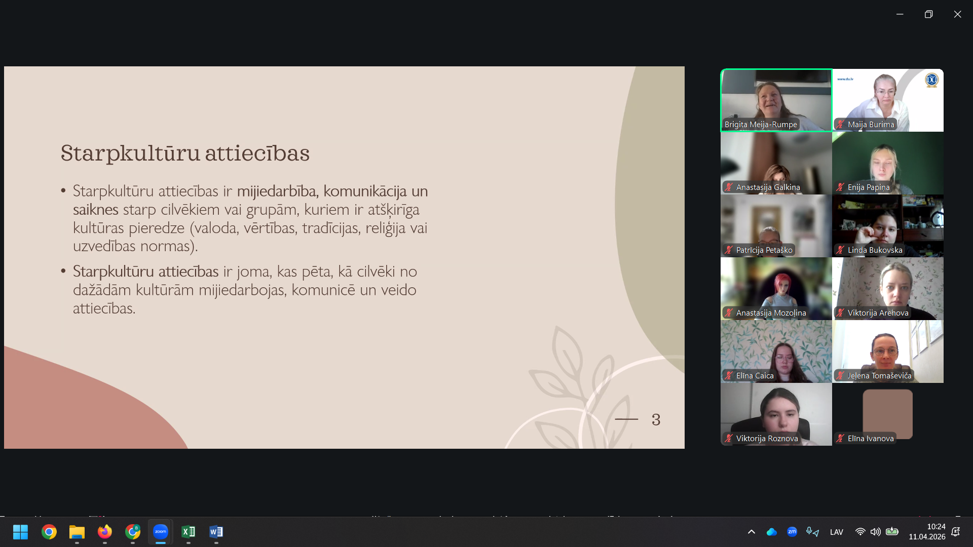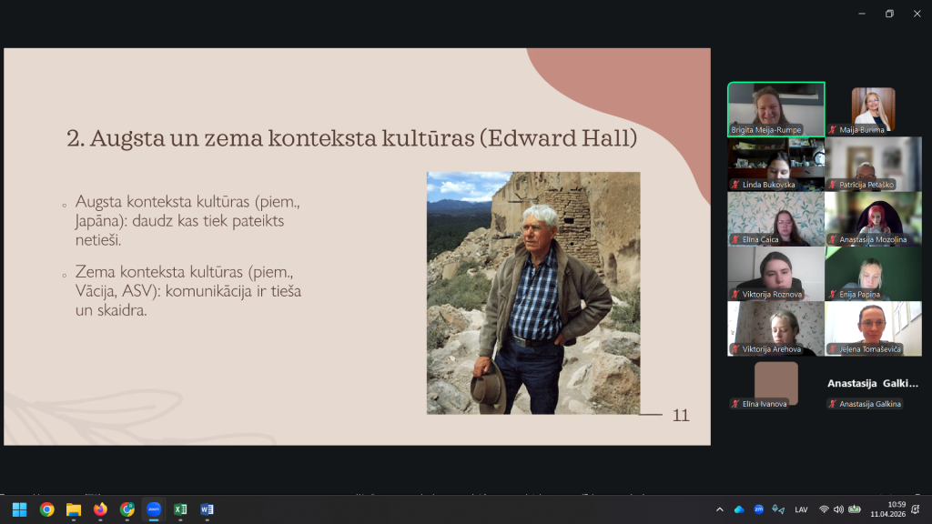 B. Meija-Rumpe skaidroja starpkultūru attiecību nozīmi, uzsverot, ka tās veido saikni starp cilvēkiem ar atšķirīgu kultūras pieredzi un pasaules redzējumu. Viņa pievērsās kultūratšķirībām ikdienas rituālos, aicinot izprast un pieņemt citādo. Tika izcelts, ka starpkultūru attiecību studijas palīdz mazināt konfliktus, izvairīties no stereotipiem un nepamatotiem pārmetumiem, kā arī veicina personīgo izaugsmi, paplašina redzesloku un uzlabo spēju darboties dažādās kultūrvidēs. Tāpat tika akcentēta to loma ekonomiskajā attīstībā un inovāciju radīšanā. Nodarbībā tika aplūkotas svarīgas teorētiskās pieejas, tostarp Gērta Hofstedes kultūras dimensiju teorija, kas palīdz izprast kultūru atšķirības, kā arī Edvarda Hola piedāvātais dalījums augsta un zema konteksta kultūrās, ilustrējot komunikācijas īpatnības dažādās valstīs. Noslēgumā tika apskatīta adaptācijas teorija, kas skaidro cilvēka pielāgošanos jaunai kultūrai.