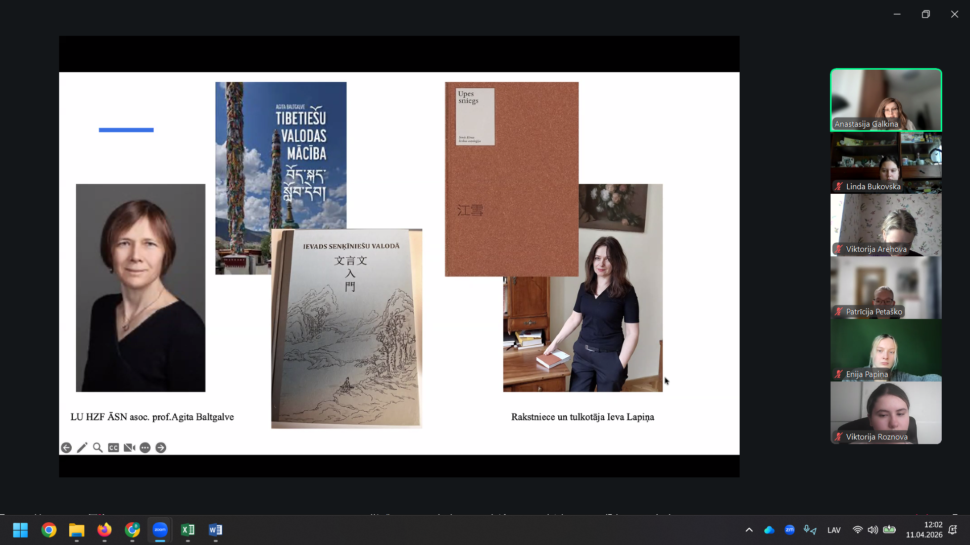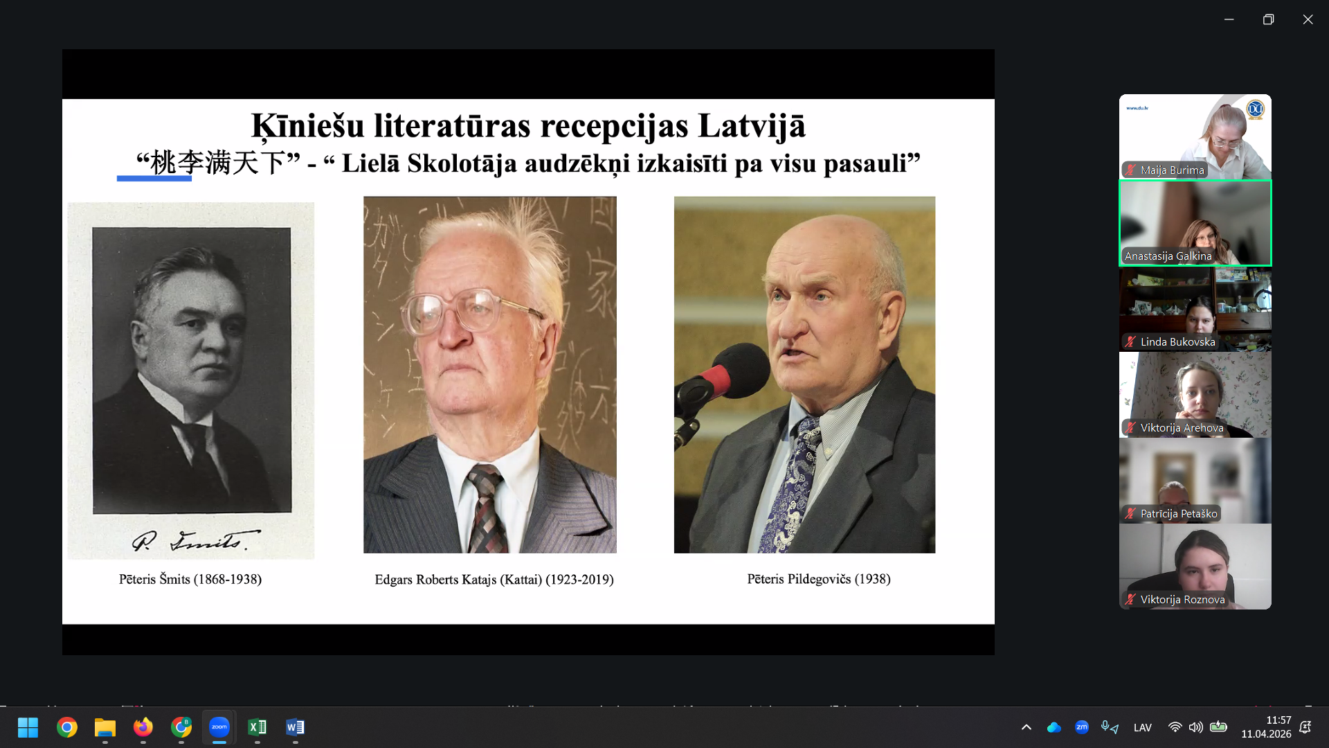 A. Galkina stāstīja par ķīniešu valodas īpatnībām un Konfūcija ideju nozīmi, kā arī raksturoja tulkošanas procesu, izvērtējot dažādus tulkojumu veidus un ar tiem saistītās grūtības. Tika minēti vairāki daiļliteratūras tekstu piemēri, īpaši izceļot Annas Sakses grāmatas “Pasakas par ziediem” tulkojumu ķīniešu valodā. Tik sniegta informācija par topošo Kārļa Skalbes grāmatas tulkojumu. A. Galkina uzsvēra, ka, apgūstot ķīniešu valodu, viens no lielākajiem izaicinājumiem ir pareiza toņu izruna, jo to daudzveidība būtiski ietekmē vārdu semantiku.