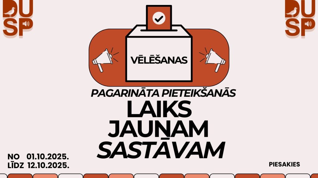 Daugavpils Universitātes Studentu padome aicina visus studējošos, kuri vēlas aktīvi iesaistīties studentu pārstāvniecībā, veicināt DU prestižu un līdzdarboties aktuālu jautājumu risināšanā, kandidēt DU SP vēlēšanās!