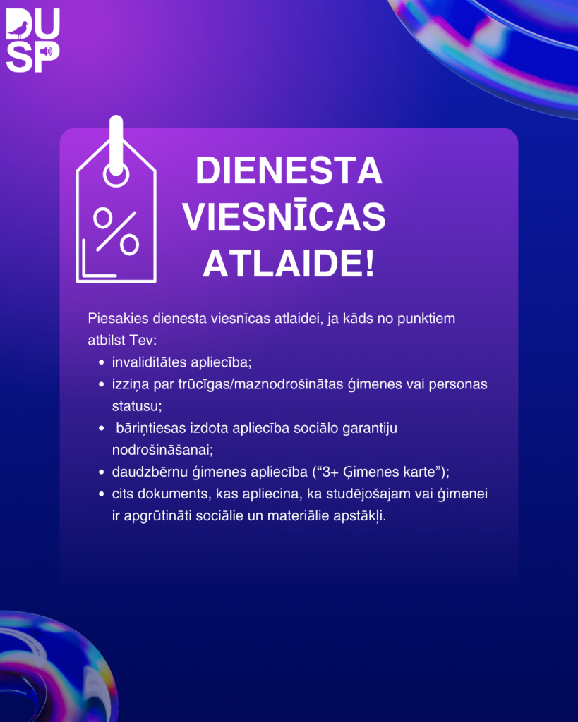 Sekmīgi Daugavpils Universitātes (DU) dienesta viesnīcās dzīvojošie DU studējošie ar apgrūtinātiem sociāliem un materiāliem apstākļiem ir aicināti pieteikties 50% atlaidei dienesta viesnīcu ikmēneša īres maksai 2026. studiju gada pavasara semestrī.
