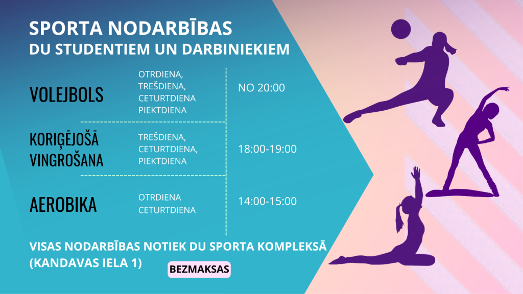Aicinām studentus un darbiniekus izmantot šo iespēju, lai stiprinātu veselību, pilnveidotu fizisko sagatavotību un smeltos enerģiju kopīgās sportiskās aktivitātēs.