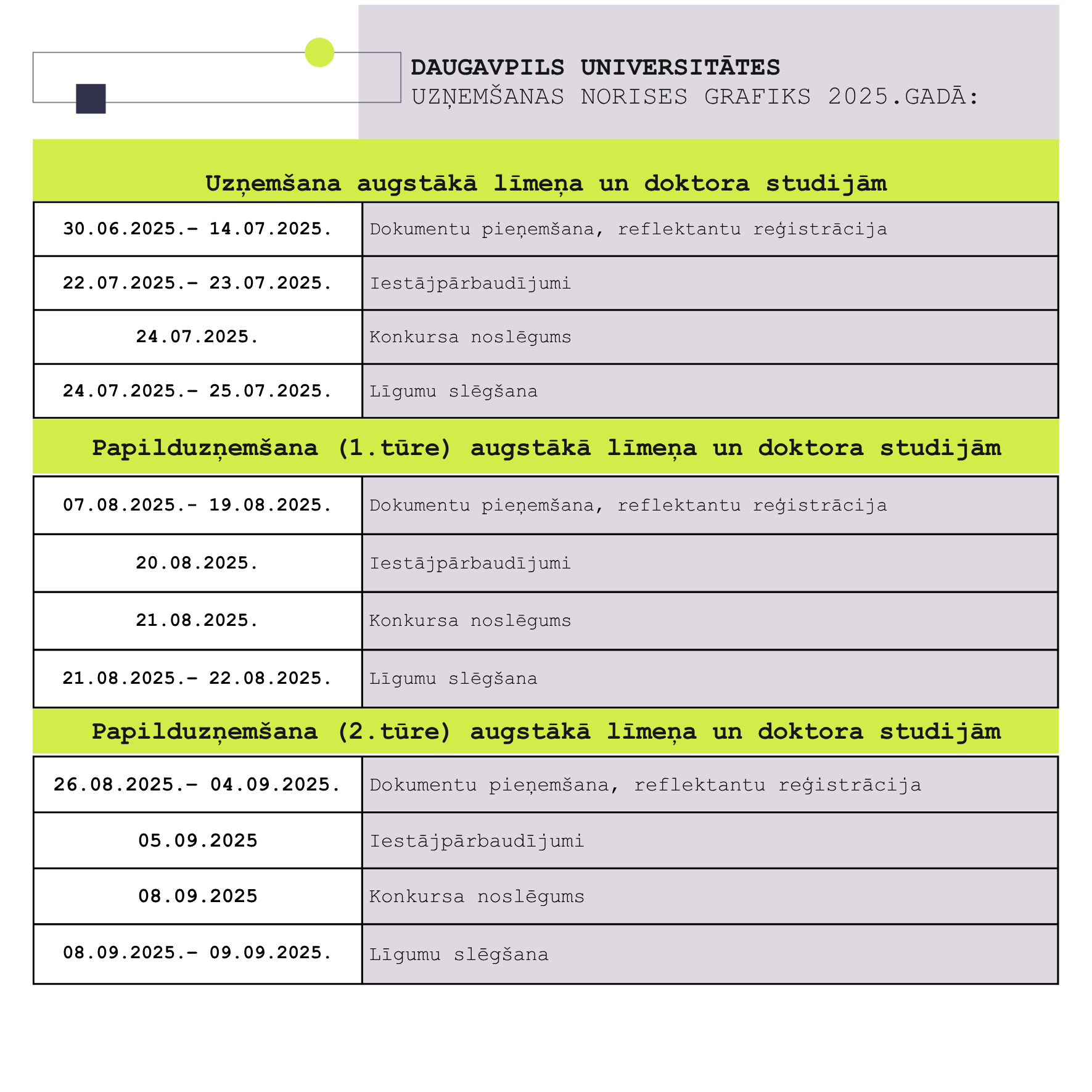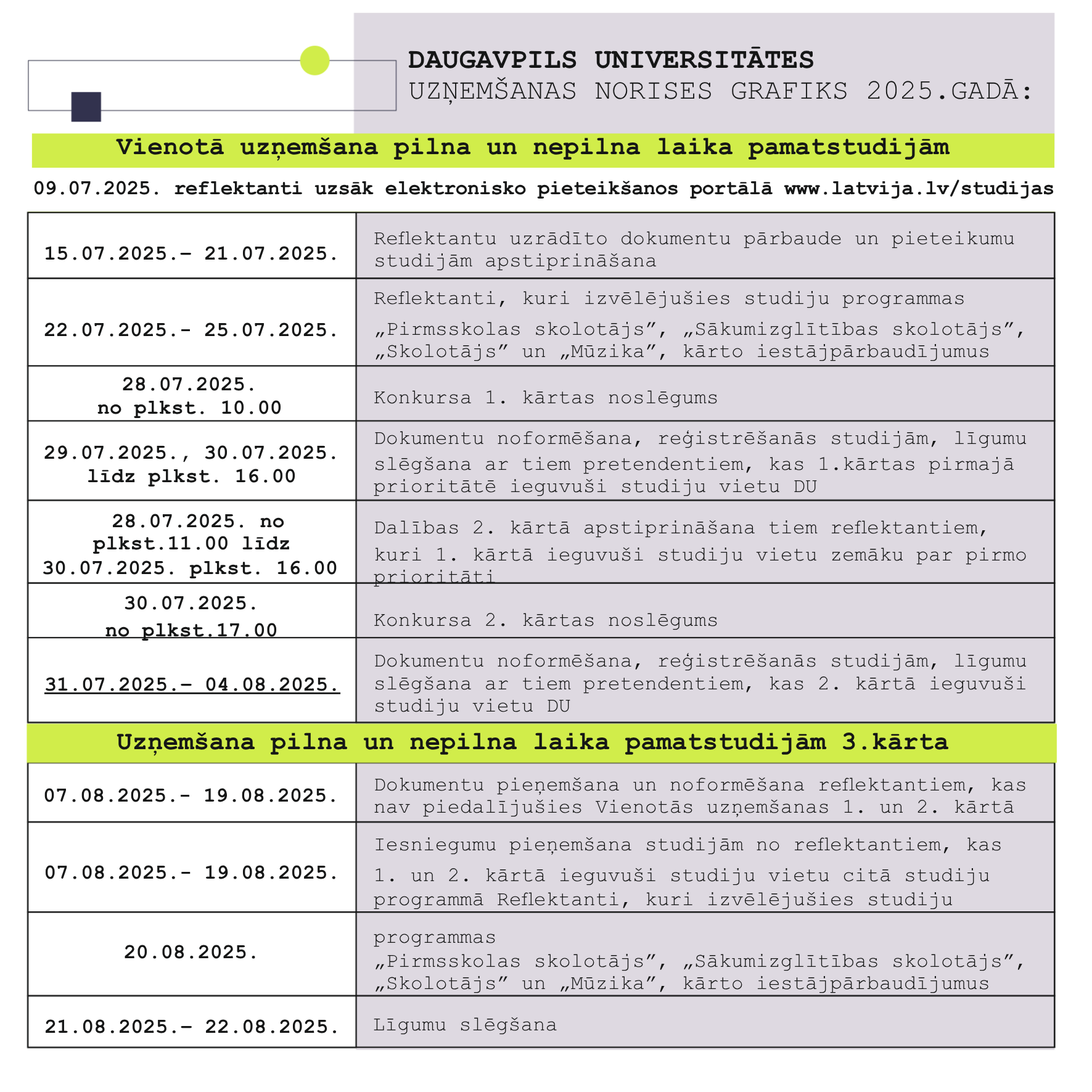 Pieteikšanās pamatstudijām klatienē – no 2025. gada 15. jūlija plkst. 9:00. līdz 21. jūlijam plkst. 17:00.