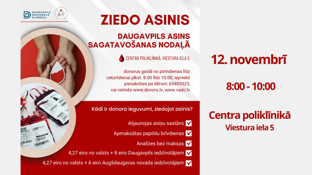 Šī gada 12. novembrī no plkst. 8:00 līdz 10:00, Daugavpils Asins sagatavošanas nodaļā, Viestura ielā 5, Centrā poliklīnikā norisināsies donoru diena.
