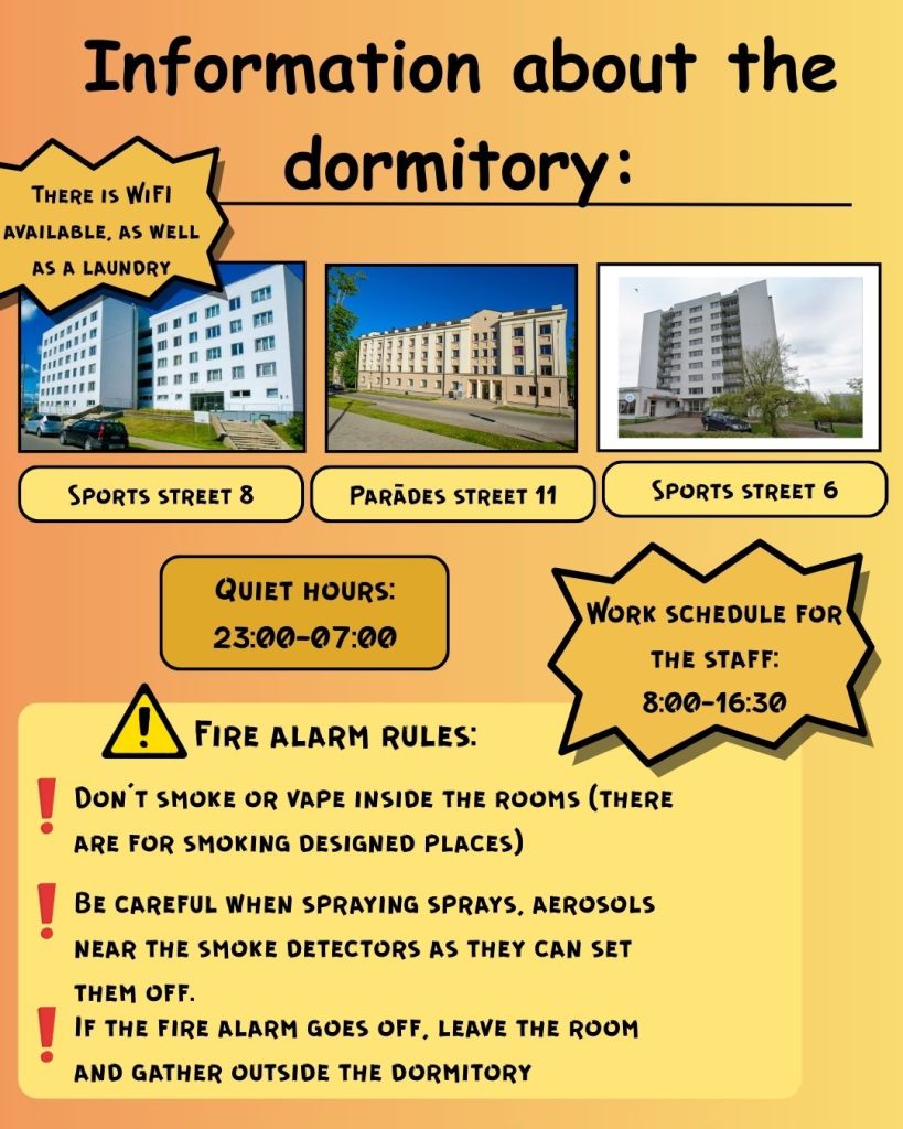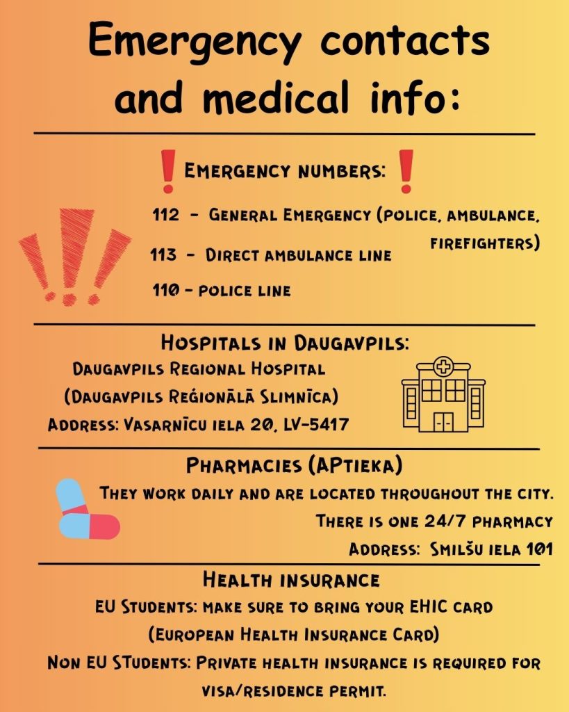 Medical Cabinet – in case of an illness, students can visit the DU Medical Cabinet at Parades street 11–8a, Daugavpils. Working days: Mon-Fri; working hours: 08.00-14.00. Sat-Sat closed. Visit is free of charge.