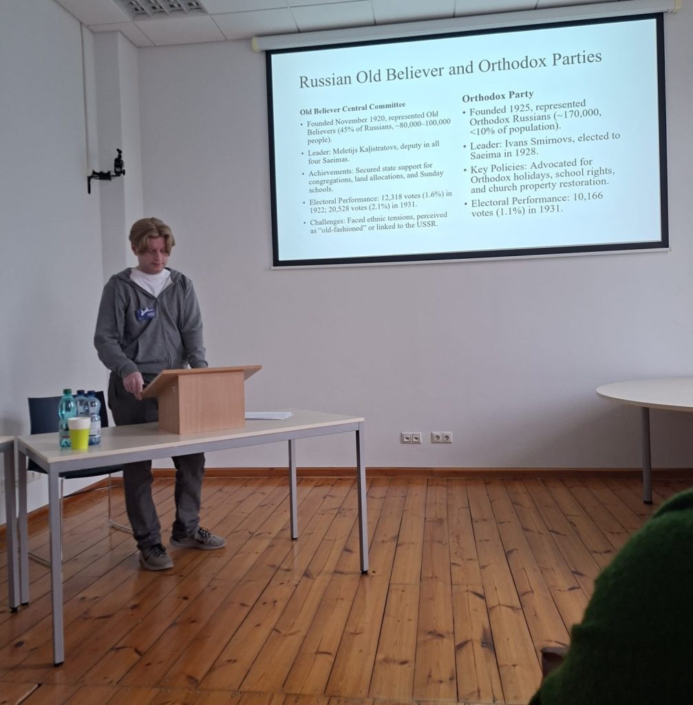2. kursa akadēmiskā maģistra studiju programmas students Viktors Punculis prezentēja referātu “Development of the Daugavpils Tram Line (1945-1963)” (zinātniskais vadītājs Dr. hist., asoc. prof. H. Soms) un Vladislavs Matvejevs uzstājās ar prezentāciju “Religion, Identity, and Parliamentary Democracy: The Case of Latvia (1920–1934)” (zinātniskā vadītāja Dr. Theol., prof. A. Stašulāne).
