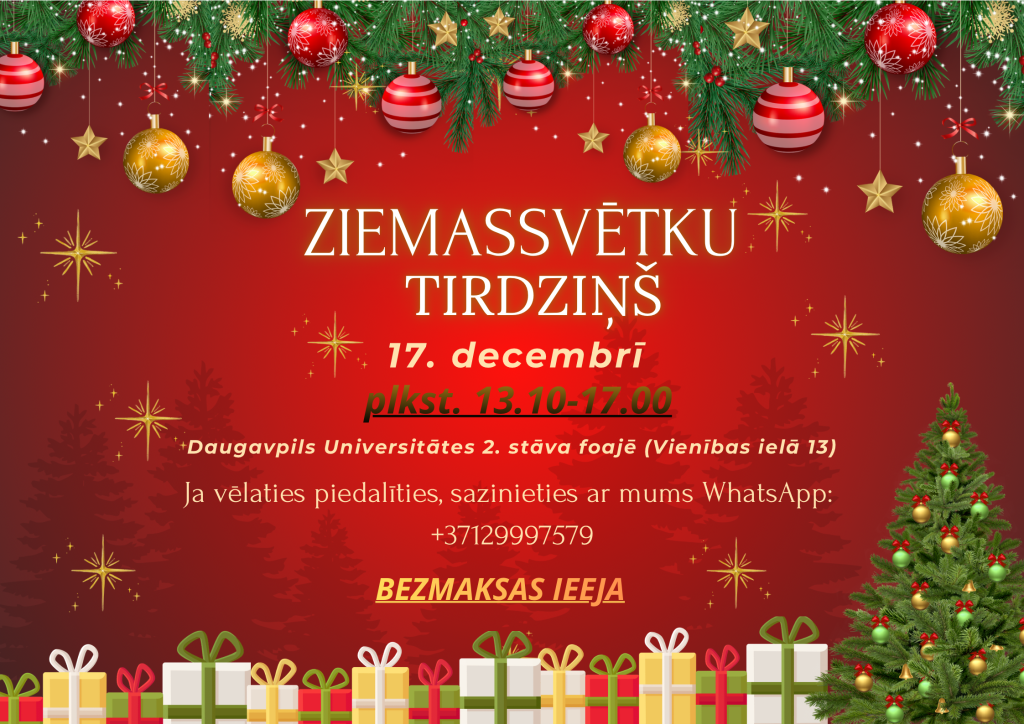 2025. gada 17. decembrī no plkst. 13.10 līdz 17.00 Vienības ielā 13, Daugavpils Universitātes 2. stāva foajē notiks Ziemassvētku tirdziņš, kuru organizē profesionālās studiju programmas “Mākslas menedžments” 1. kurss.