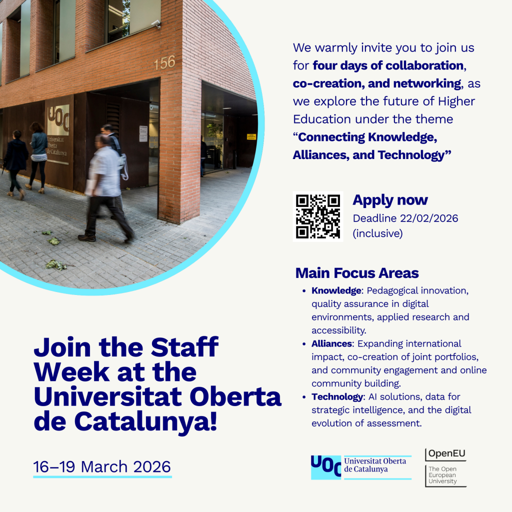 We are pleased to invite you to the Staff Week organised by Open University of Catalonia, which will take place from 16 to 19 March.