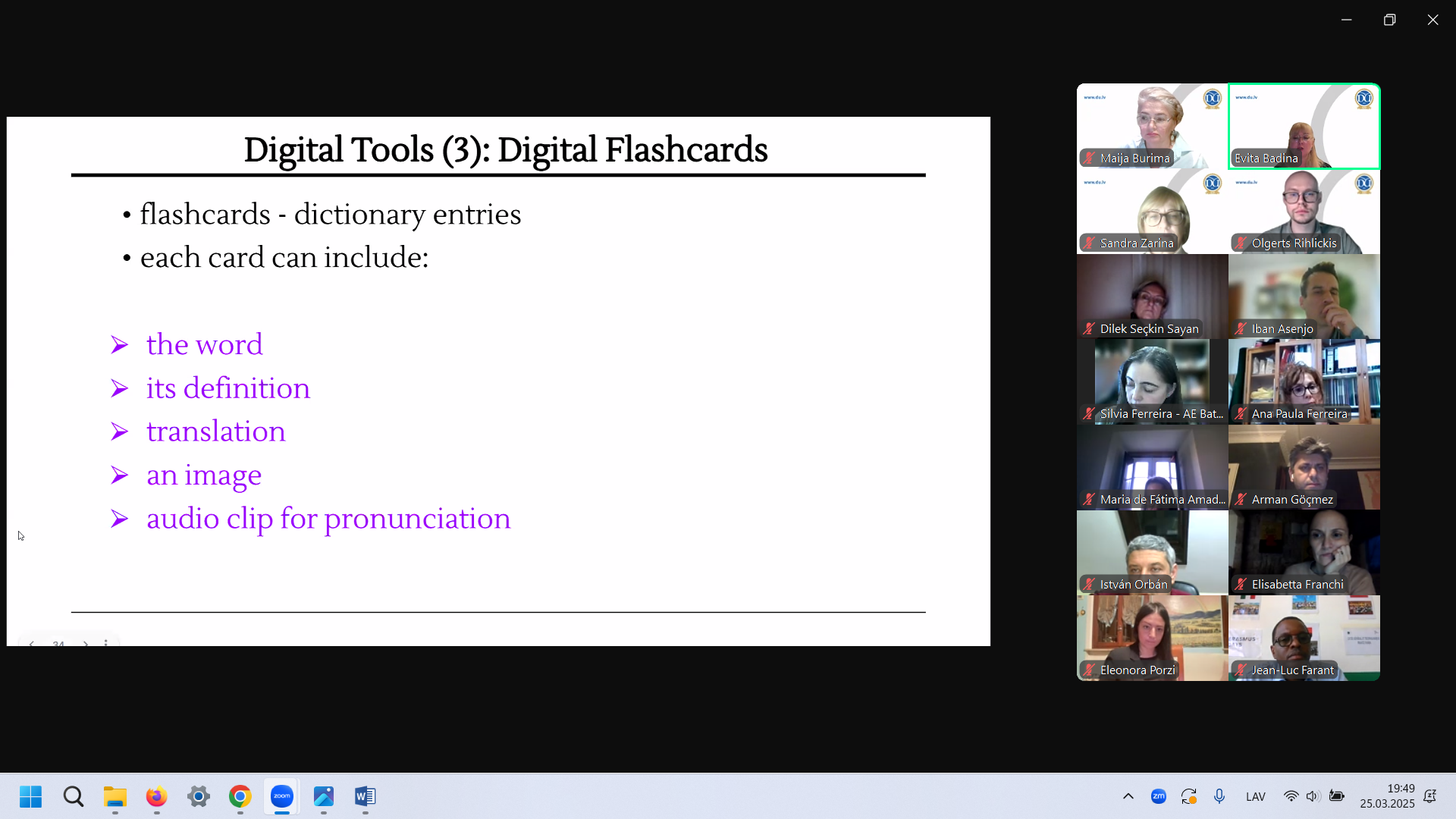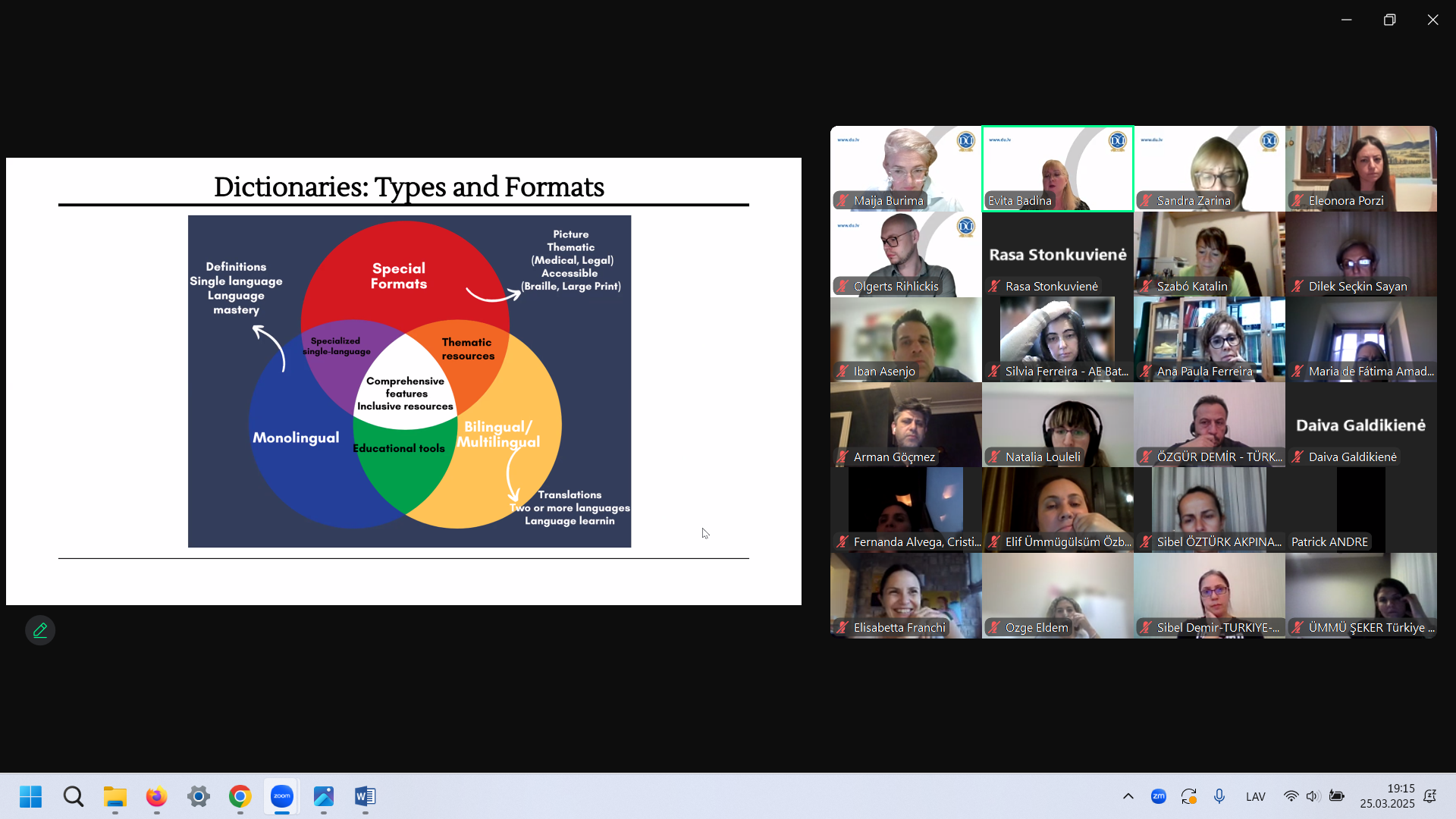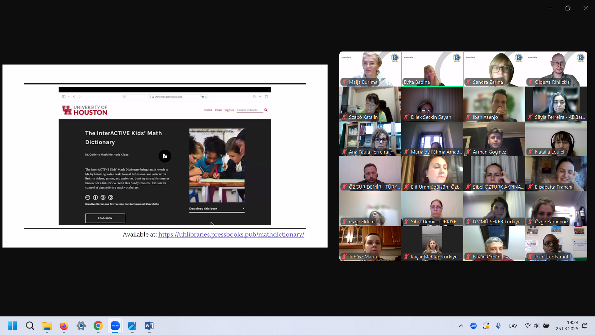 2025. gada 25. martā projekta “Valodas integrētu skolas mācību priekšmetu izglītības modelis” (Education Model through Language Integrated School Subjects, Nr. 2023-2-HU01-KA220-SCH-000178547) ietvaros Daugavpils Universitātes projekta īstenotāji vadīja visu projekta partnerinstitūciju dalībniekiem vebināru “Vārdnīcas valodā integrētā mācību priekšmetu apguvē” (Dictionaries for Designing Language Integrated School Subjects Models). Vebināra mērķis – raksturot mūsdienu vārdnīcu izveides tendences un iepazīstināt ar vārdnīcu modeļiem, kas rosinātu projektā paredzētās vārdnīcas prototipa izveidi.